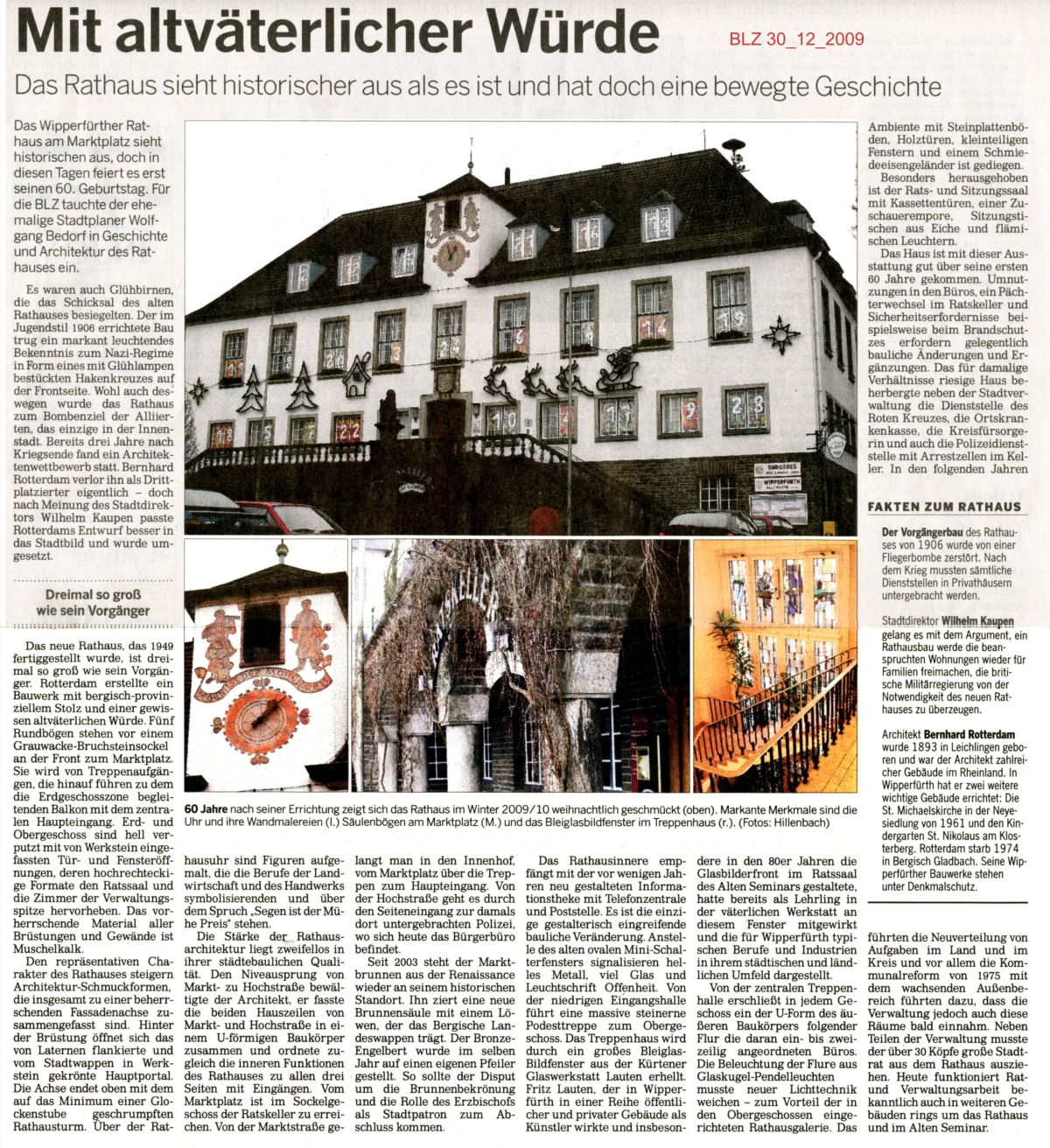 Die BLZ berichtete am 30.12.2009 ausführlich über den Neubau des heutigen Rathauses (Artikel). Wir möchten ergänzend zu dem Artikel einige Fotos zeigen, die damals während der Bauphase in den Jahren 1949 bis 1950 entstanden sind. Die Fotos wurden uns vom Stadtarchiv der Stadt Wipperfürth und von Georg Eck zur Verfügung gestellt.